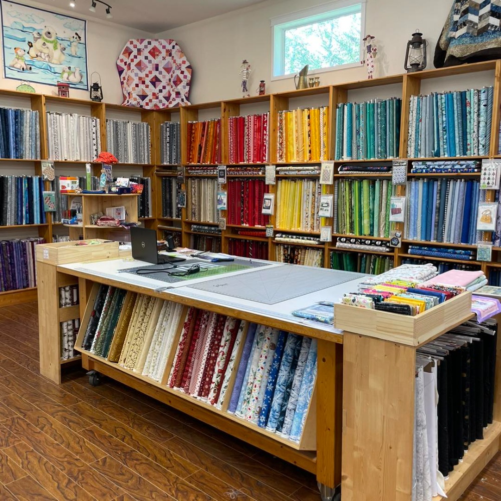 Inside Homestead Quilting: shelves of vibrant cotton fabrics surround the cutting table.